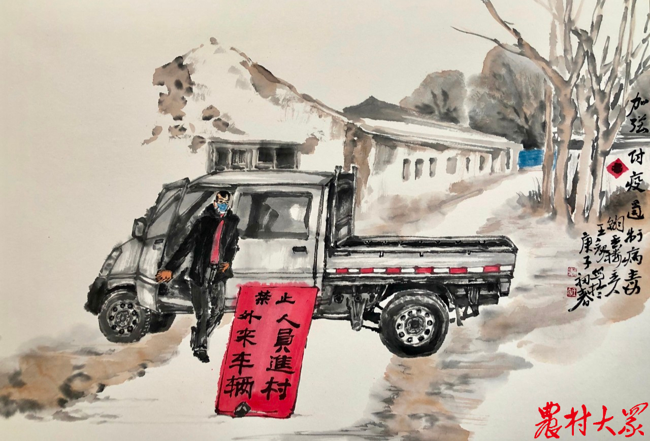 “这一周以来,我戴上口罩,开着车,跑了30多个村,能停车的地方我就迅速画下来,不能停车的地方就拍照片回来再画。就这样边拍边画,边画边拍,我就是要把乡村群众这种众志成城抗疫情的激动场面记录下来。”电话那头,王剑告诉农村大众报记者。
