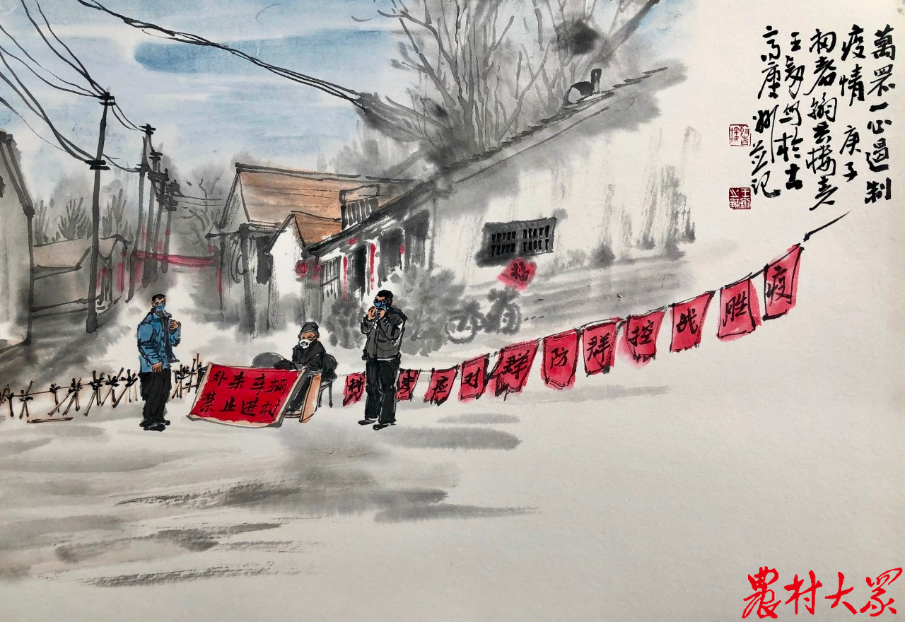 王剑国画作品《设卡桥头防瘟疫,村口排查有担当》