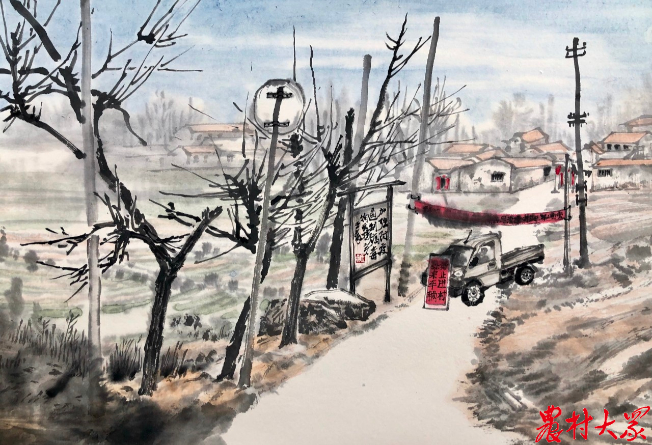 王剑告诉农村大众报记者,一路上,他严格做好防护,带着口罩,车内开着内循环,坚决不开车窗。由于处处封村,他就把车停在村口,只是远远地看,静静地用画笔记录这些正在发生的历史。他把这组纪实写生作品命名为《全县村村战疫情》,每一幅画都有一个村庄原型。