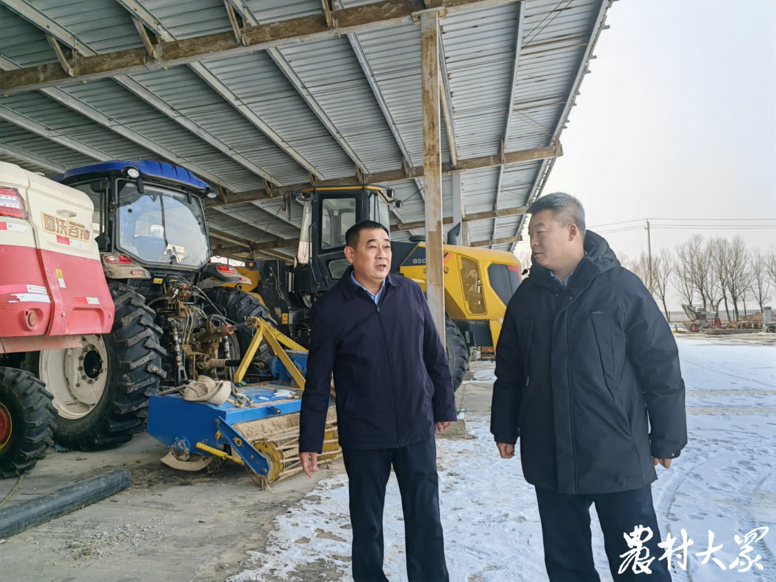 庞增华(左)向镇级田长马守良介绍农机存放情况。
