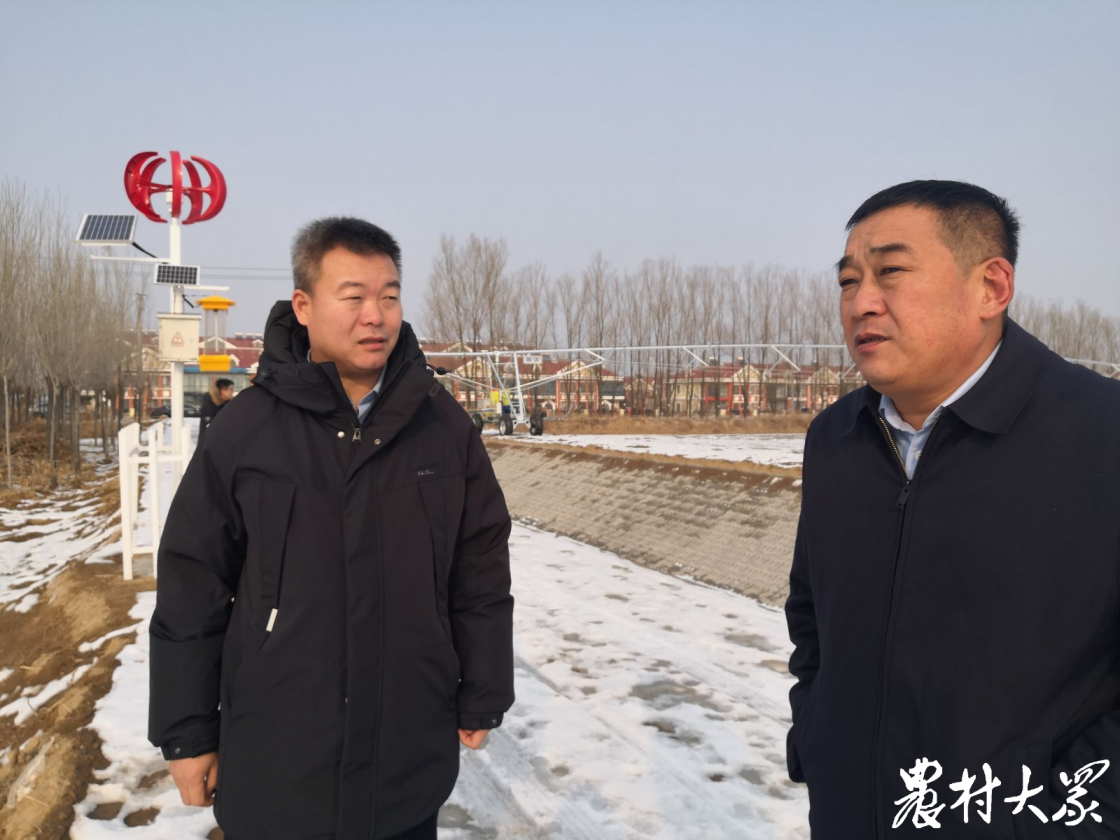 庞增华(右)向镇级田长马守良汇报麦田防冻情况。
