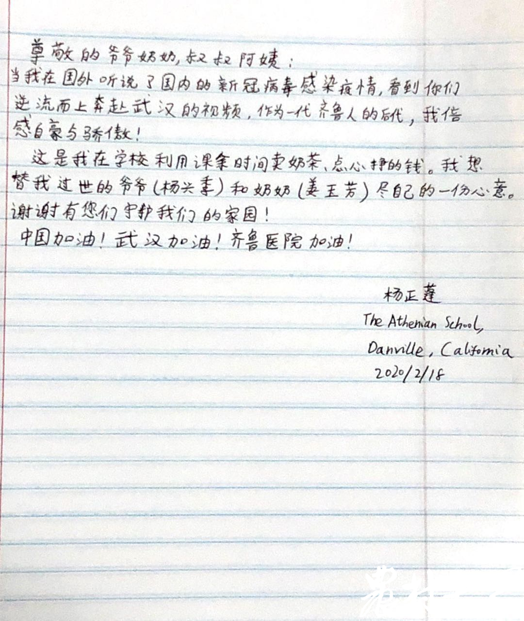 他在写给齐鲁医院职工和医疗队员的信中说:“尊敬的爷爷奶奶,叔叔阿姨,当我在国外听说了国内的新冠病毒感染疫情,看到你们逆流而上奔赴武汉的视频,作为齐鲁人的后代,我备感自豪与骄傲!这是我在学校利用课余时间卖奶茶、点心挣得钱。我想替我过世的爷爷(杨兴季)和奶奶(姜玉芳)尽自己的一份心意。谢谢由您们守护我们的家园!中国加油!武汉加油!齐鲁医院加油!”